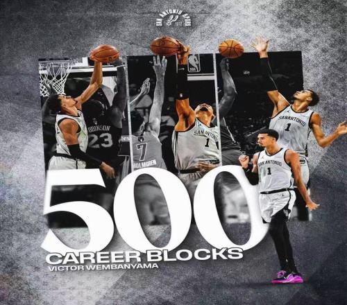 文班亞馬達(dá)成生涯500個(gè)蓋帽里程碑,創(chuàng)造歷史第二年輕500蓋帽紀(jì)錄,且只用143場(chǎng)達(dá)成500蓋帽創(chuàng)造歷史第4快紀(jì)錄。