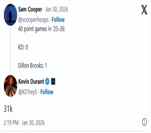 作為交易杜蘭特的籌碼之一,狄龍本賽季的表現(xiàn)非常出色,近日單場轟下40分,創(chuàng)生涯新高。有球迷指出,效力太陽隊期間,狄龍的40+得分場次是1場,比杜蘭特(0場)還多,杜蘭特則回復道:“31K”,顯然是以自己生涯累計31736分的成就予以回應。