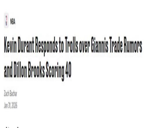 北京時間2月1日,鍵盤俠KD又上線了!火箭隊球星杜蘭特,對于自己的名字卷入字母哥與密爾沃基雄鹿隊的交易流言一事,頗感意外。此外,他還回應了狄龍近日40分爆發(fā)。