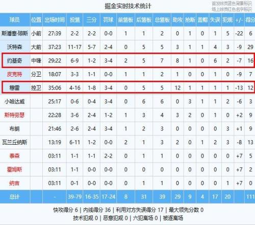 掘金:沃特森29分5板3助、約基奇16分7板8助、瓦蘭丘納斯13分3板2助、穆雷12分5板12助、斯特勞瑟9分4板3助2斷、布朗9分3板、皮克特7分2板1助