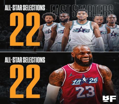 詹姆斯生涯第22次入選全明星,與東部首發(fā)五人入選次數(shù)之和相同