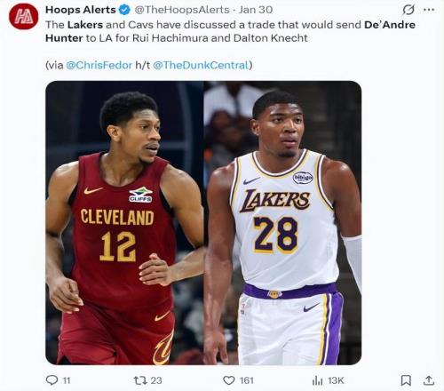 1月30日時,騎士隊記者克里斯-菲德爾就透露,騎士與湖人探索過關(guān)于亨特的交易,湖人希望用克內(nèi)克特、八村壘去換亨特。