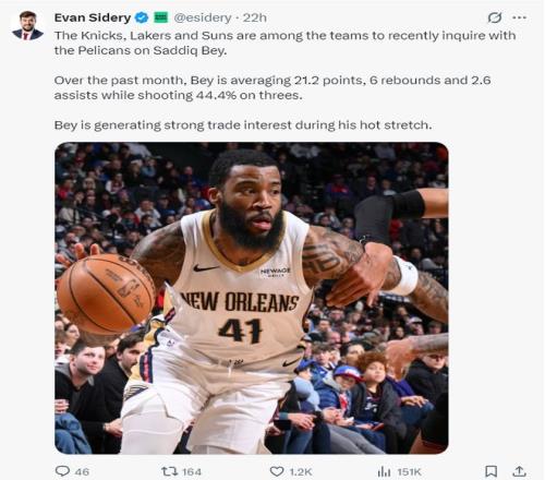 根據(jù)《福布斯體育》記者埃文-斯迪瑞的報道,尼克斯、湖人、太陽正在追逐鵜鶘前鋒薩迪克-貝,過去一個月里貝場均21.2分6籃板2.6助攻,三分命中率高達(dá)44.4%,貝的火熱狀態(tài)引發(fā)了交易討論。