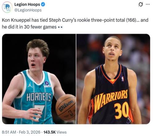 本場(chǎng)克努佩爾手感不佳,三分12投4中,拿下17分9板2助攻,即便如此,在本場(chǎng)比賽結(jié)束后克努佩爾還是成功追平庫(kù)里新秀賽季三分命中數(shù)紀(jì)錄。