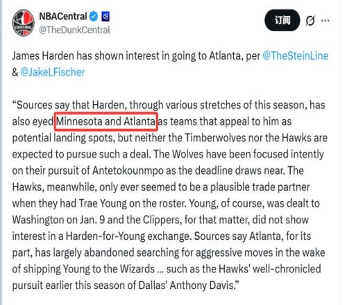 消息源透露,本賽季多個(gè)階段里,哈登都將森林狼與老鷹視為心儀的潛在下家,但森林狼與老鷹兩隊(duì)預(yù)計(jì)都不會(huì)推進(jìn)相關(guān)交易。