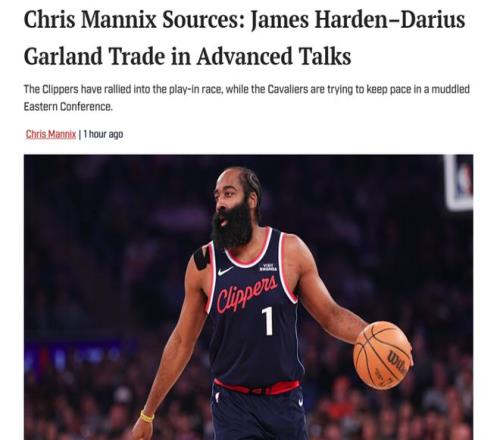 消息最先由《體育畫(huà)報(bào)》名記Chris Mannix曝出,多位消息人士向其透露,快船與騎士正在圍繞哈登與加蘭互換進(jìn)行深入討論。