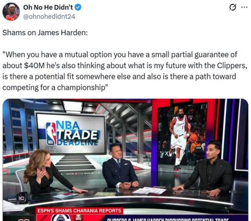ESPN名記Shams隨后發(fā)文確認(rèn)消息真實(shí)性,同時(shí)跟進(jìn)表示哈登與快船雙方都在討論能否在交易截止日前離隊(duì),并且雙方都在尋找感興趣的下家進(jìn)行討論。