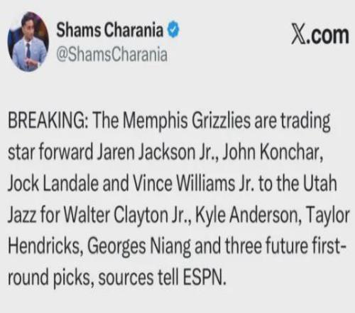 爆料王Shams:灰熊將3J+康查爾+蘭代爾+小文斯-威廉姆斯送至爵士,換回李凱爾+小克萊頓+亨德里克斯+尼昂+三個首輪簽。