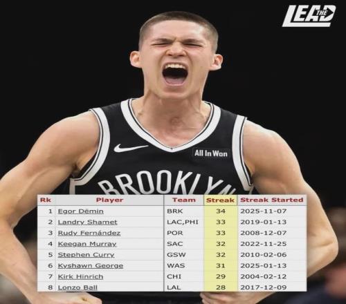 此外,杰明在新秀賽季連續(xù)34場投進(jìn)三分球,超越蘭德里-沙梅特(33場),高居NBA新秀歷史第一!今天要寫的就是籃網(wǎng)8號秀葉戈爾-杰明,最新一期的NBA官方新秀榜,杰明僅排第9。再加上籃網(wǎng)戰(zhàn)績差,所以杰明關(guān)注度并不高。