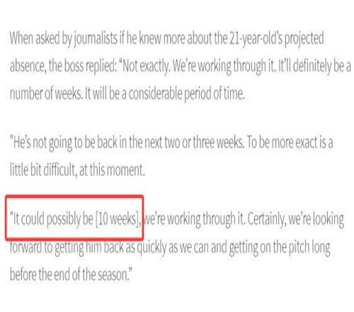 卡里克表示:「可能需要10周時間,我們正在積極為他治療。當然,希望他能盡快回到球場,在結束之前能重新參加比賽。這確實是一個打擊,失去球員,他們無法參賽,總是令人失望,因為陣容就少了一個選擇。尤其是帕特里克這樣,他在過去幾周發(fā)揮如此重要作用,真正提升了球隊的水平。」
