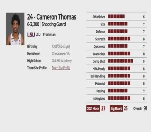 缺點:技術(shù)比較單一,主要目標是得分,在其他方面貢獻不多,雖然他的臂展(2米)不錯,但身體素質(zhì)和運動能力最多只能算中等,速度和爆發(fā)力都不是頂尖球員,很難在運球突破時穩(wěn)定地殺到籃下,很多籃下攻框都被封蓋,永遠不會成為組織核心,很難成為雙能衛(wèi),擁有拋投能力,但穩(wěn)定性不足,他的投籃選擇需要改進,三分球命中率起伏不定,很少傳球,拿到球后通常只想出手,有些人甚至認為他在進攻端可能會成為“黑洞”,防守意識不強,很少給進攻球員制造麻煩,也很少在被擋住或被突破后積極回防,盡管是隊內(nèi)得分王,但在上賽季路易斯安那州立大學(xué)的關(guān)鍵時刻,通常被排在第二或第三進攻選擇.