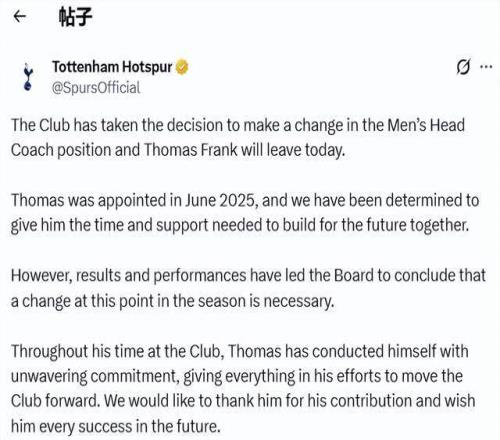 去年夏天,弗蘭克正式擔(dān)任熱刺主帥,簽約至2028年夏天。執(zhí)教熱刺不到1年,弗蘭克帶隊(duì)38場(chǎng)比賽,成績(jī)是13勝10平15負(fù)。盡管熱刺在英超表現(xiàn)令人失望,但在歐冠,熱刺8場(chǎng)17分高居第4位,拿到直通16強(qiáng)席位。