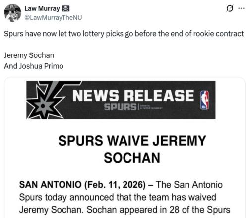 賽前馬刺官方宣布裁掉22年9號秀杰里米-索漢,這是馬刺連續(xù)第二年裁掉樂透秀,上個賽季馬刺曾裁掉21年12號秀普里莫,兩人都沒能執(zhí)行完新秀合同。