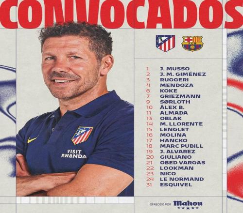 馬德里競技官方公布了國王杯半決賽首回合主場對陣巴薩的比賽大名單,格列茲曼領(lǐng)銜,瑟洛特回歸。