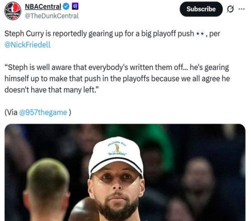 勇士記者Nick Friedell也在灣區(qū)電臺(tái)節(jié)目中公開(kāi)表示:“庫(kù)里深知大家都已經(jīng)將他們排除在外,但他正在全力以赴,準(zhǔn)備在季后賽中奮力一搏,因?yàn)樗腥硕贾懒艚o他的機(jī)會(huì)不多了?!?/p>