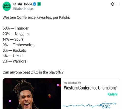 火箭隊(duì)6%僅排第五!在常規(guī)賽程過(guò)半,全明星周末即將到來(lái)之際,西部冠軍概率更新出爐,其中湖人4%、勇士2%、掘金20%屈居第二,雷霆超5成斷檔第一。