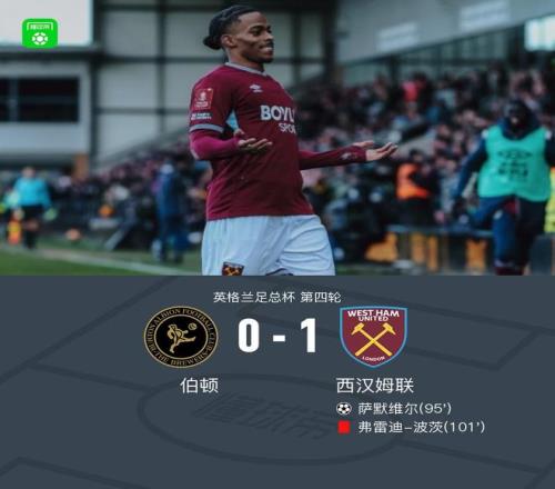 足總杯:西漢姆聯(lián)10伯頓晉級,薩默維爾加時制勝,波茨染紅