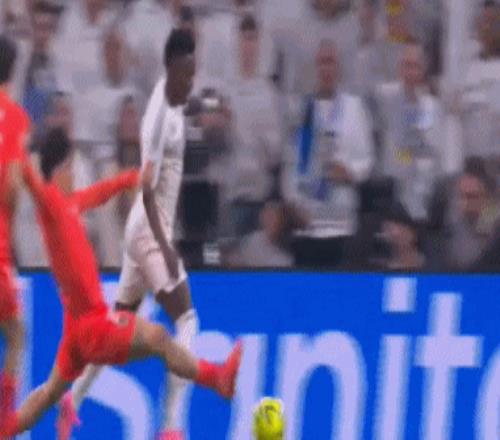 第4分鐘,卡馬文加犯規(guī)送給對手一個定位球,索萊爾腳后跟一磕,奧亞薩瓦爾跟上爆射,擦著左側立柱偏出,皇馬逃過一劫。