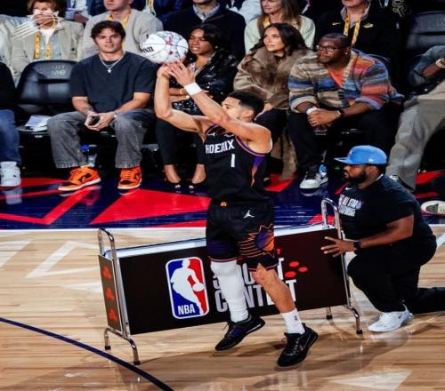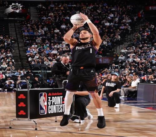 利拉德第二個出場,前16個球命中了14個,包括一個4分的花球。后面準(zhǔn)度有所下滑,最終仍有29分。布克一上來也不遑多讓,連中九個球,后面也投進(jìn)了一顆四分球。還剩三個花球的時候,布克拿到27分,剩下三個花球投進(jìn)一顆追平利拉德,投進(jìn)兩顆就拿到冠軍。然后布克三個花球全部投丟,成為三分大賽歷史非常戲劇性的一幕。