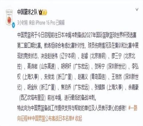 中國(guó)男籃官宣世預(yù)賽14人名單,徐杰曾凡博落選,內(nèi)線稍顯單薄