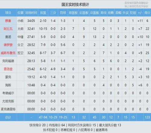 國(guó)王后衛(wèi)拉塞爾-威斯布魯克出戰(zhàn)32分鐘,投籃17中8,三分7中3,罰球7中6,得到25分2籃板7助攻1搶斷,正負(fù)值+9。國(guó)王內(nèi)線阿丘瓦15中10,得到22分12籃板。德羅贊9投7中,高效率砍下19分2籃板4助攻2搶斷2蓋帽。