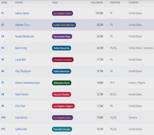 國(guó)王隊(duì)為了輸球,有時(shí)候收官階段故意換下威少和德羅贊。今天國(guó)王是真想贏球了,決勝階段依然把他倆留在場(chǎng)上。近日有媒體盤點(diǎn)了足球、籃球和橄欖球的球星Ins粉絲數(shù),威少2250萬粉絲排名NBA第三,僅次于詹姆斯和庫(kù)里。