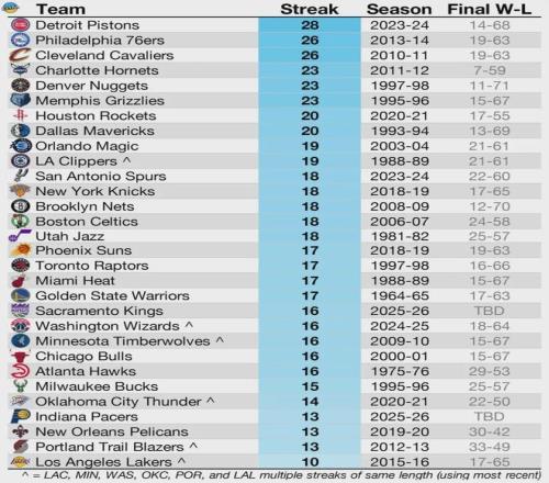 下面這張圖有點(diǎn)意思,聯(lián)盟各支球隊(duì)的隊(duì)史最長(zhǎng)連敗紀(jì)錄:活塞28連敗;76人和騎士都是26連??;黃蜂、灰熊和掘金則是23連敗;火箭和獨(dú)行俠是20連敗。國(guó)王的16連敗,根本排不到前列。湖人隊(duì)史最長(zhǎng)連敗只有10連敗,聯(lián)盟最少。