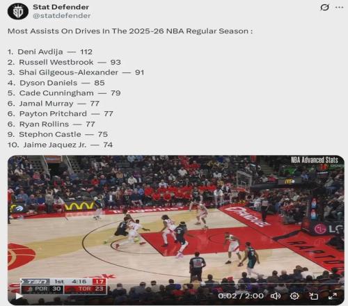 威少的合同是1年360萬美元底薪,打著打著成了國(guó)王兩大核心之一。威少有一項(xiàng)數(shù)據(jù)排名聯(lián)盟前列,本賽季突破后的助攻次數(shù)(截至2月18日):威少93次排名聯(lián)盟第二,阿夫迪亞112次位列聯(lián)盟第一,亞歷山大91次排名聯(lián)盟第三。