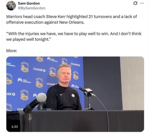 科爾還專門指出失誤與執(zhí)行力問題,強調(diào)球隊全場出現(xiàn)21次失誤太多,也正如科爾所說,由于傷病問題過于嚴(yán)重,現(xiàn)有勇士球員硬實力有限,想要贏球必須持續(xù)打出高水準(zhǔn),稍有偏差就會輸球,而本場勇士部分球員又表現(xiàn)不夠出色。